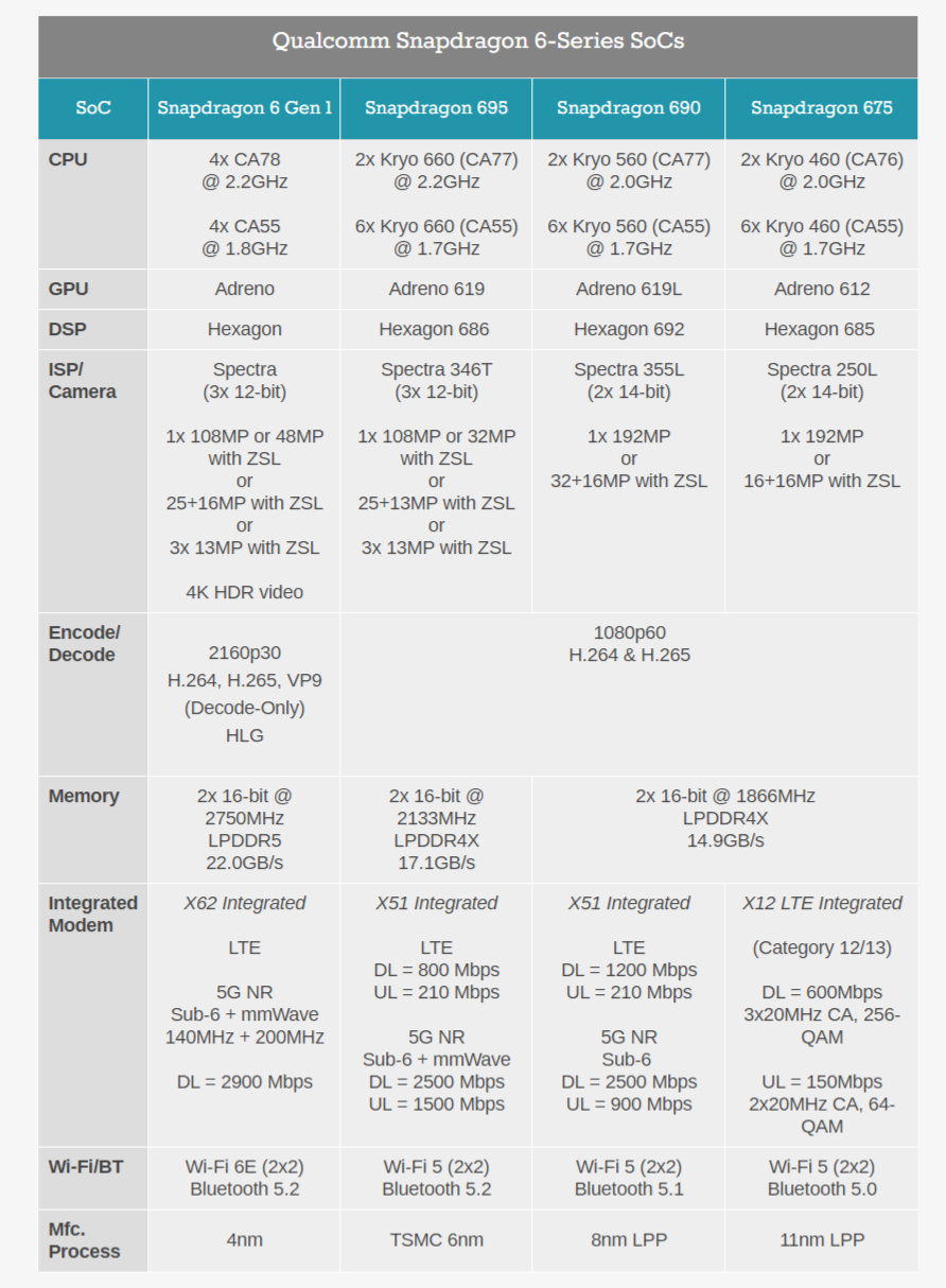 骁龙 6 Gen 1 采用不明 4nm 工艺(高通尚未具体说明是三星还是台积电),取代了此前的骁龙 695。在此过程中,对 CPU、相机、内存和调制解调器模块进行了一些重大更新。