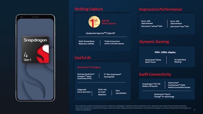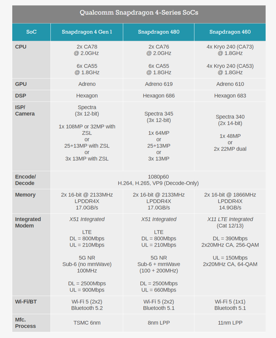 与此同时,高通 SoC 的入门级产品是新的骁龙 4 Gen 1。与骁龙 6 Gen 1 不同的是,高通没有对这款芯片进行广泛更新,但骁龙 4 Gen 1 仍比前代骁龙 480 提供了一些适度的改进。