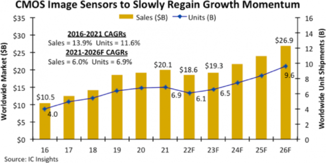 该报告指出,在经过 2020 年 4% 和 2021 年 5% 的微弱增长后,2022 年,全球 CMOS 图像传感器市场将从去年的 201 亿美元下降至 186 亿美元(约 1300。14 亿元人民币),降低 7%。同时,分析机构 IC Insights 预测到,2023 年,全球 CMOS 图像传感器市场将增长 4%,恢复至 193 亿美元。未来几年,CMOS 图像传感器市场将保持增长,并在 2026 年达到 269 亿美元。