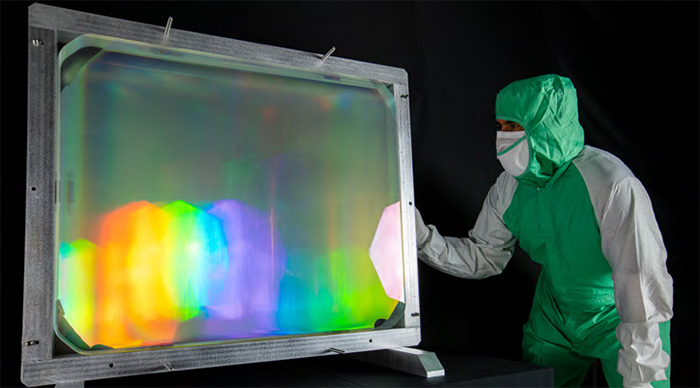 一名技术人员检查最近制作的八个HELD光栅中的一个,该光栅将安装在L4-ATON激光系统的18米长、55吨的压缩机上。图片来源:LLNL