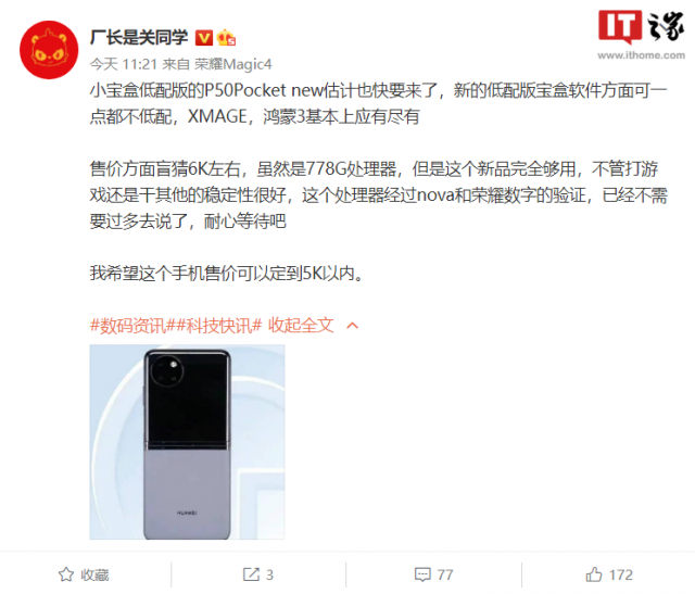 微博博主 @厂长是关同学 称,华为 P50 宝盒低配版的 P50 Pocket new 将很快发布,软件方面搭载华为 XMAGE 影像、鸿蒙 HarmonyOS 3。0 应有尽有,不过处理器是骁龙 778G。售价预计在6000 元左右,但希望定到 5000 元以内。