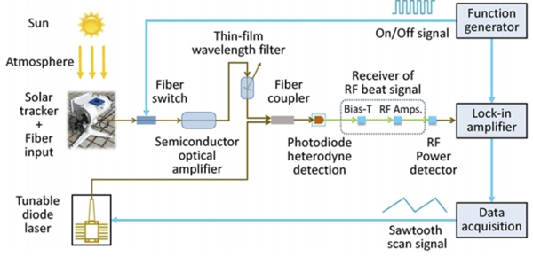 激光外差光谱仪因具有高光谱分辨率、体积小、易集成等优点,已经逐渐发展成为与地基傅里叶变换光谱仪互补的温室气体柱浓度与廓线测量工具。激光外差光谱技术因受限于光学天线理论,无法通过增加光学接收口径的方法提高外差信号信噪比,这导致高分辨率激光外差探测中气体廓线测量精度受限。对此,研究人员提出基于半导体光放大技术的微弱太阳光放大方法,解决了高分辨率激光外差探测中光学天线理论限制的外差信号信噪比提高问题。研究结果表明,相比于传统的高分辨率激光外差光谱仪,所研发的基于半导体光放大的高分辨率激光外差光谱仪的弱光信号探测和气体浓度测量精度得到大幅提升。