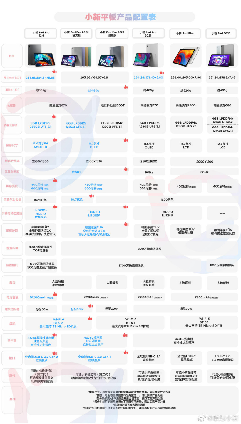 以下是联想小新 Pad Pro 2022 平板与之前产品的配置对比: