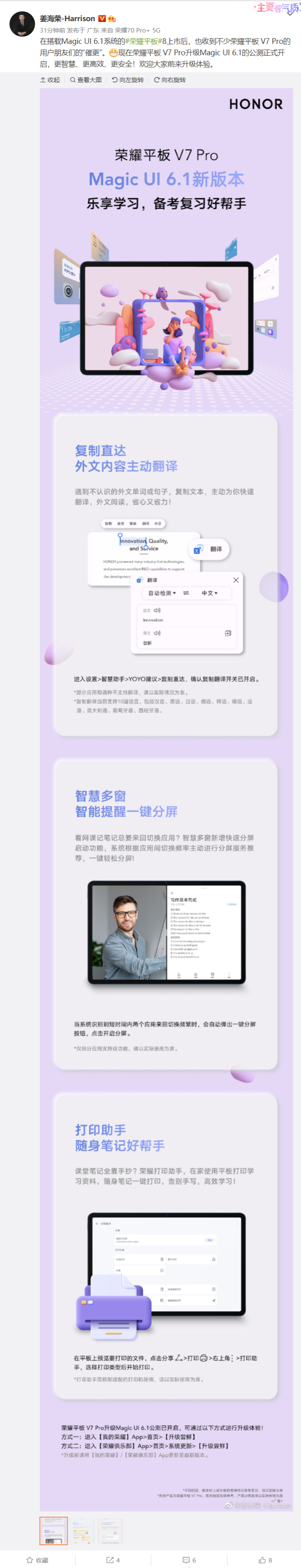 8 月 10 日消息,据荣耀方面宣布,荣耀平板 V7 Pro 升级 Magic UI 6。1 的公测正式开启,更智慧、更高效、更安全。