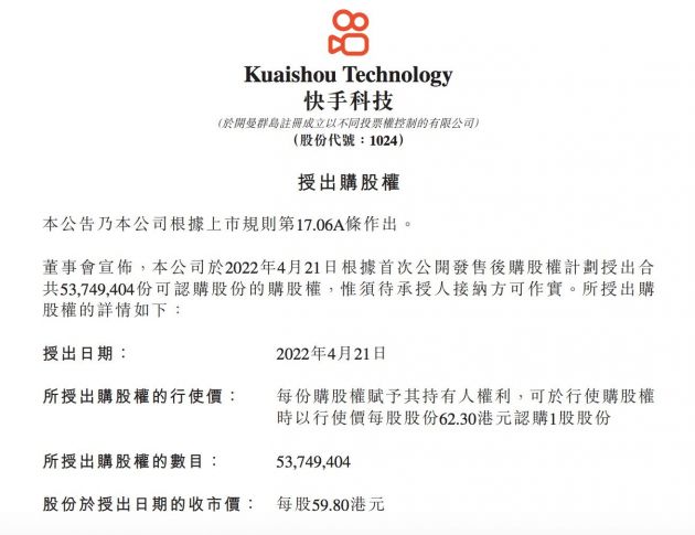 4月21日消息,快手在港交所发布公告称,于2022年4月21日根据首次公开发售后购股权计划授出合共53,749,404份可认购股份的购股权,每股59。8港元,惟须待承授人接纳方可作实。