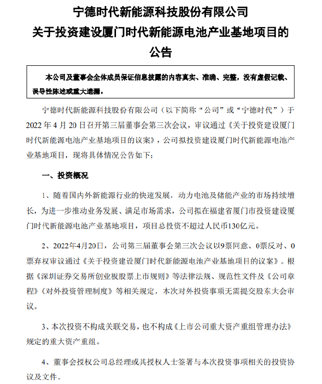 4月22日上午消息,宁德时代昨晚发布公告,拟在福建省厦门市投资建设厦门时代新能源电池产业基地项目,项目总投资不超过130亿元,建设内容为动力电池系统及储能系统生产线。